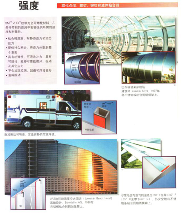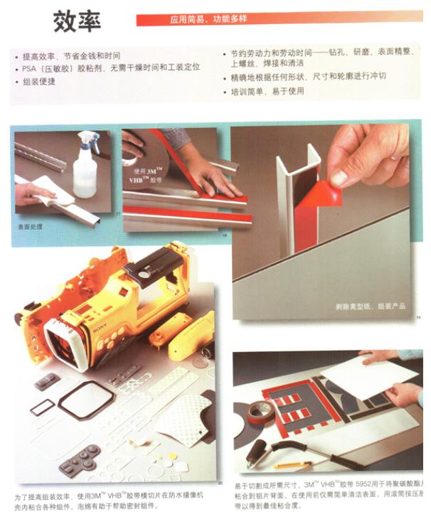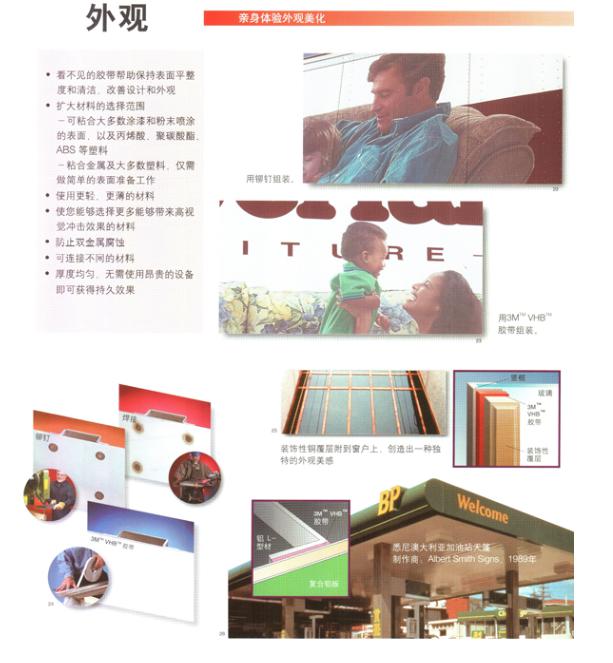 由于3M双面胶具有以上的性能优势所以被广泛适用于以下行业:增强汽车布局、紧固防锈、隔热减振和表里装修固定印刷电路板的加固板,装配空调、家具、自动售货机的加固材料;航空航天领域中的飞机制造及装配;粘贴广告用嵌板或文字,各种机架;粘贴微波炉的门嵌板,空调前部嵌板;装配铁路车辆的内外部嵌板,电板或自动扶梯的加固钢板,家用电器的装配、金属板材加强筋的固定。